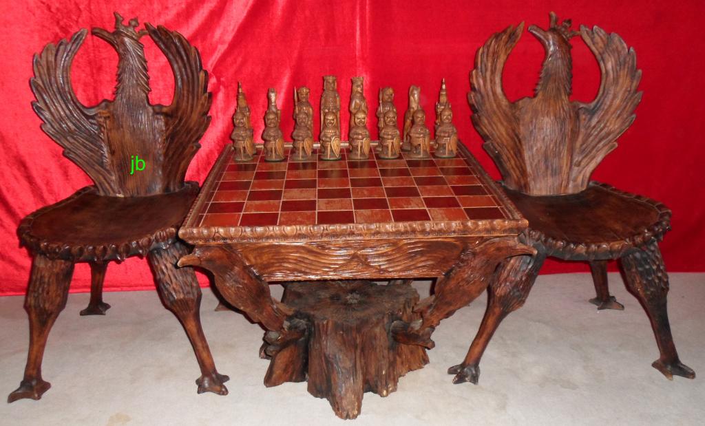 Chess table 1x1m, 2 chairs with eagle shapes and various figures.