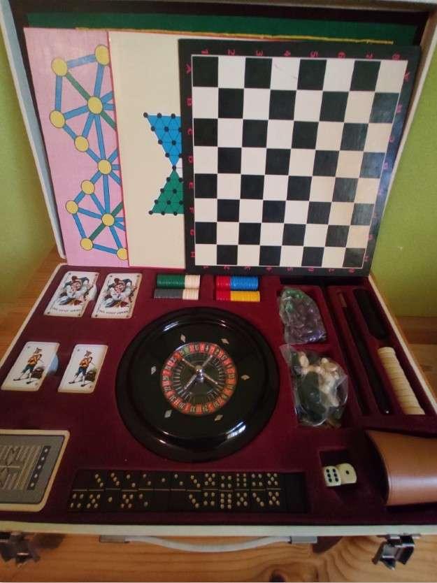 Spielekoffer (gem. Fotos) mit diversen Brettspielen, Kartenspielen, Würfelbecher, Roulette etc.