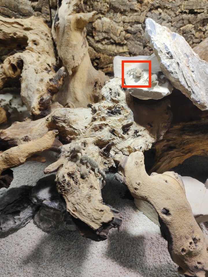 6 Männchen und 1 Weibchen. Der rot markierte Gecko ist das Weibchen und wird nicht getauscht.