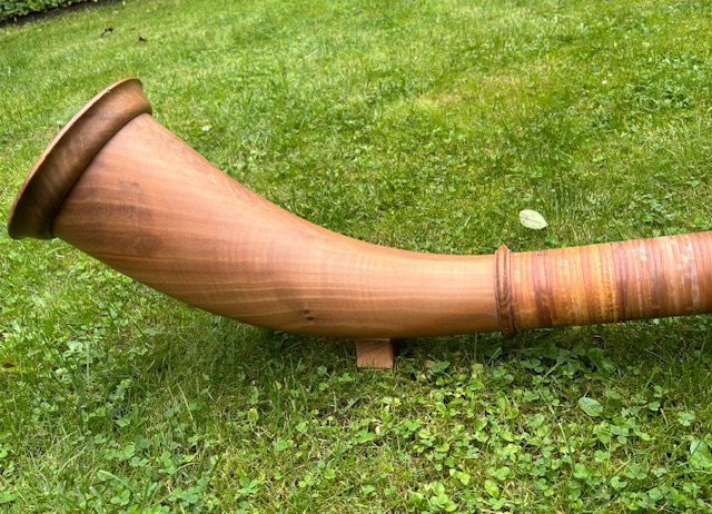 Dieses einzigartige Musikinstrument wurde in Deutschland in Bad Hindelang hergestellt. Es war das letzte Instrument, das der Alphornbauer hergestellt hat. Das Instrument wurde aus einem Stamm gefertigt, Nussbaum, sehr fein gearbeitet. Alles in Handarbeit.