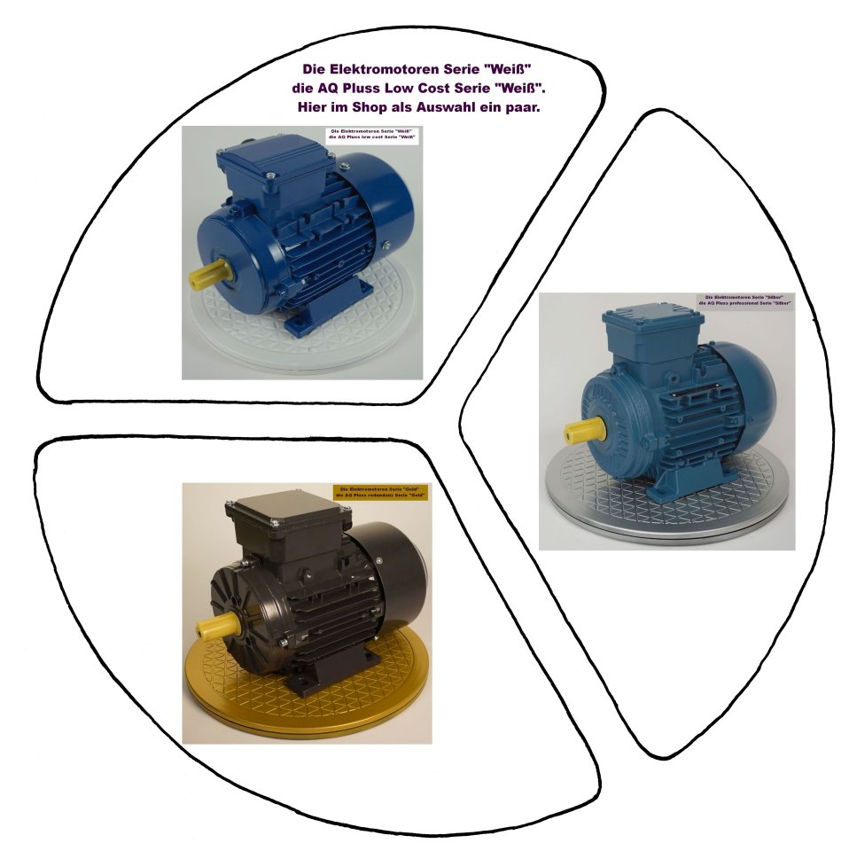 Elektromotor in 3 Serien, Unterschied ist der Servicefaktor, nämlich 1 oder 1,15 oder 1,25. Elektromotor Serie Weiß mit dem SF1, Elektromotor Serie Silber mit dem SF 1,15 und die Elektromotor Serie Gold mit dem SF 1,25. Es sind die 3 neuen Serien von AQ Pluss Motoren CAM ... . Serie Weiß - das Synonym für die Low Cost - Serie, Serie Silber - das Synonym für die Professional - Serie und die Serie Gold mit dem Synonym für die Redundanz - Serie. Die Kosten können wir nur auf Anfrage benennen, es sind Wettbewerbsgründe dafür ausschlaggebend. Suchen Sie sich einen Normmotor aus und fragen Sie den bei uns (hier die E Mailadresse dabei) den ausgesuchten E Motor an. Gerne beraten wir Sie welcher E Motor am besten zu Ihrer Anwendung paßt. Gibt es keinen passenden Ersatzmotor, gut dann können wir den neu wickeln, ebenfalls können wir den SF ..., mit "einwickeln". Jetzt AQ Pluss Motoren nutzen - bringt Nutzen !!