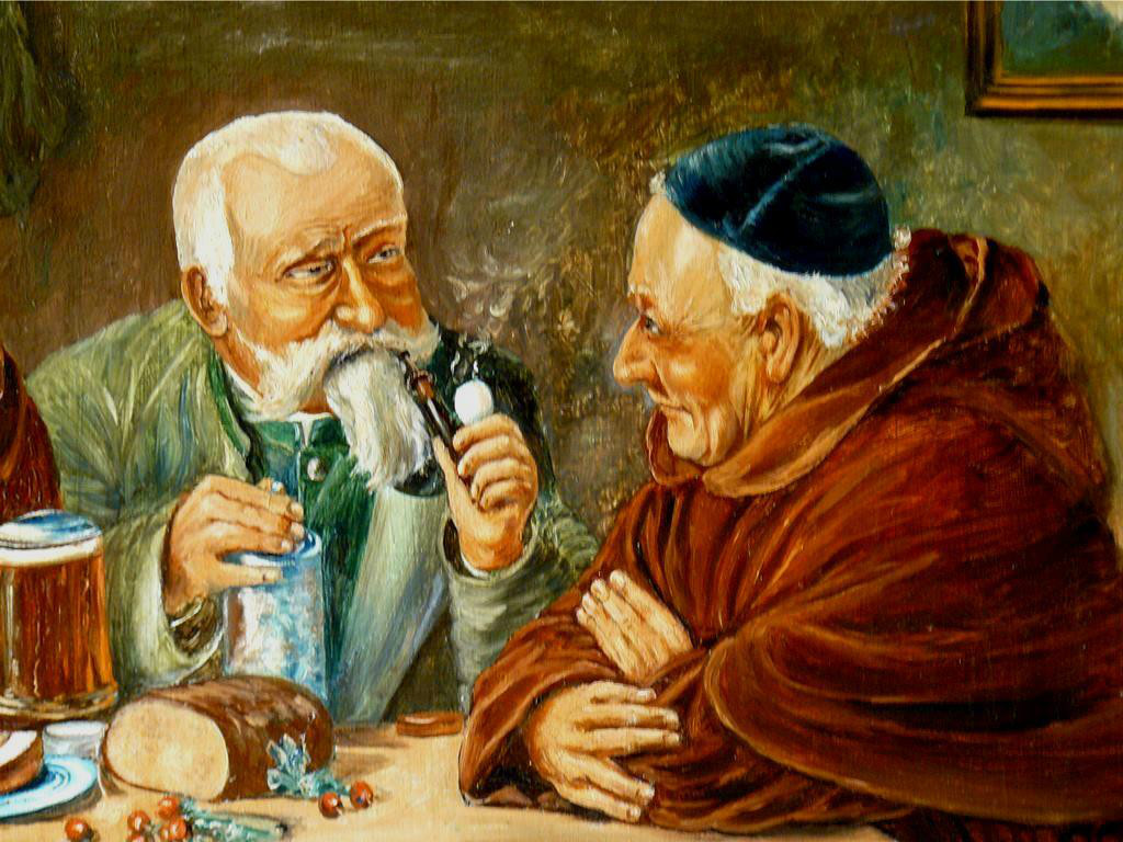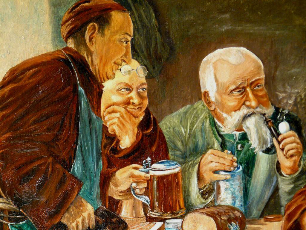 Thema: Drei Mönche und Gutsherr, verhandeln beim Vesper im Klosterkeller. Das Gemälde ist nachweislich um 1900 entstanden, es gibt davon mehrere Versionen. Es befindet sich in einem guten Zustand, Rahmen mit minimalen Bereibungen.