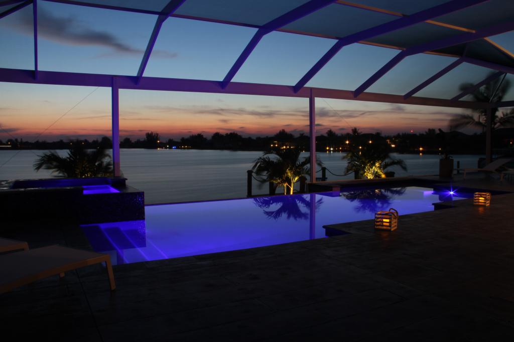 Auf der riesigen, durch einen Screen (wie in Florida üblich) geschützter Terrasse befindet sich ein großer „Endless“ Pool mit einem negative Edge, was bedeutet, dass sich in Richtung des Sees ein Wasserüberlauf befindet, welcher so wirkt, als sei der Pool mit dem See vereint. Hier können Sie die schönsten Sonnenuntergänge erleben - jeden Abend unterschiedlich und beeindruckend. Ebenfalls gibt es einen Spa (Whirlpool) und eine Sonnen-Liegefläche im Wasser.
