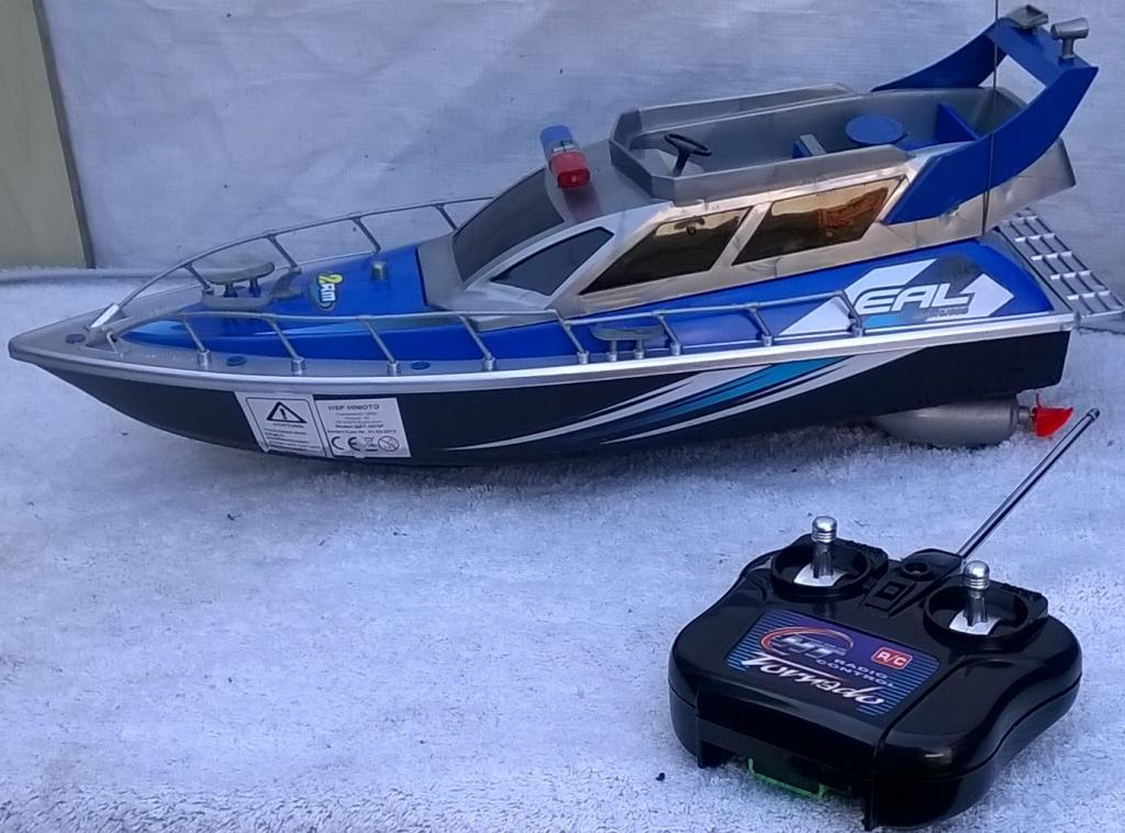 Grosses RC Polizeiboot - ca. 43cm - mit Fernsteuerung (Akku-Betrieb). Kanäle: 2 Geschwindigkeit: ca. 7 Km/h Sender: 2 Kanal